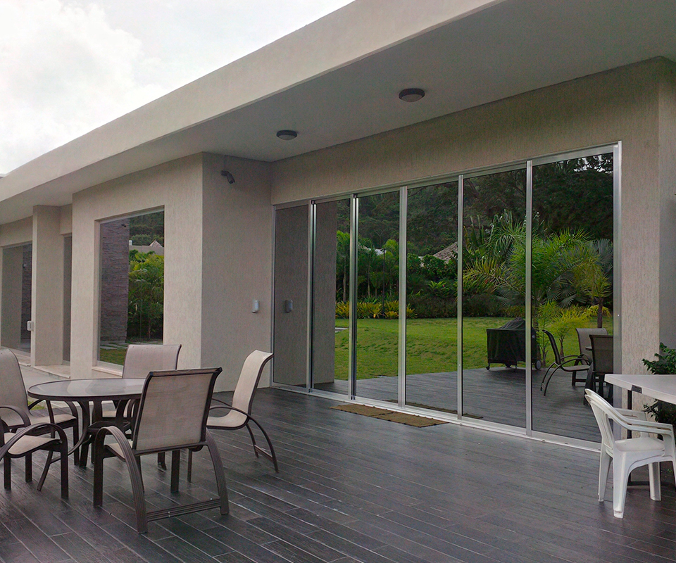 Puertas Corredizas con detalles en aluminio y cristal laminado reflectivo.