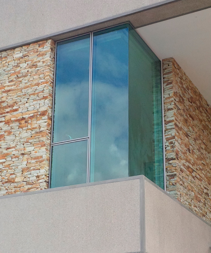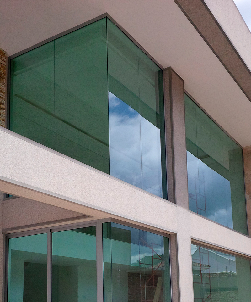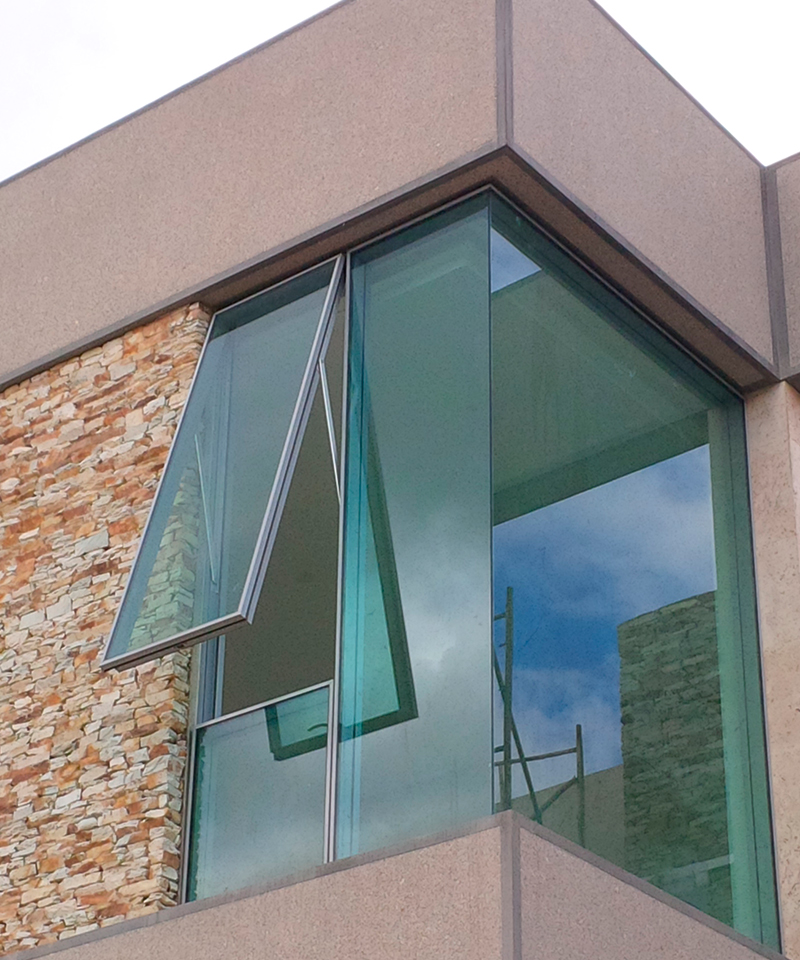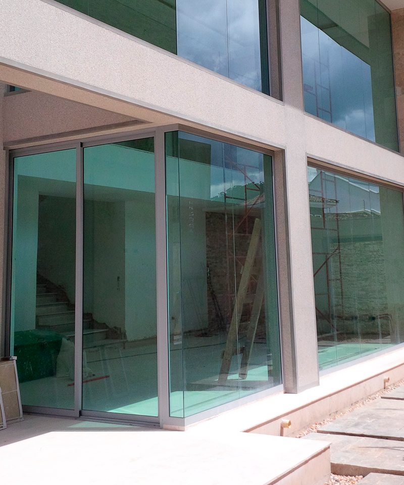 Arquitectura moderna compuesta por cristales con puertas corredizas y ventana proyectante.