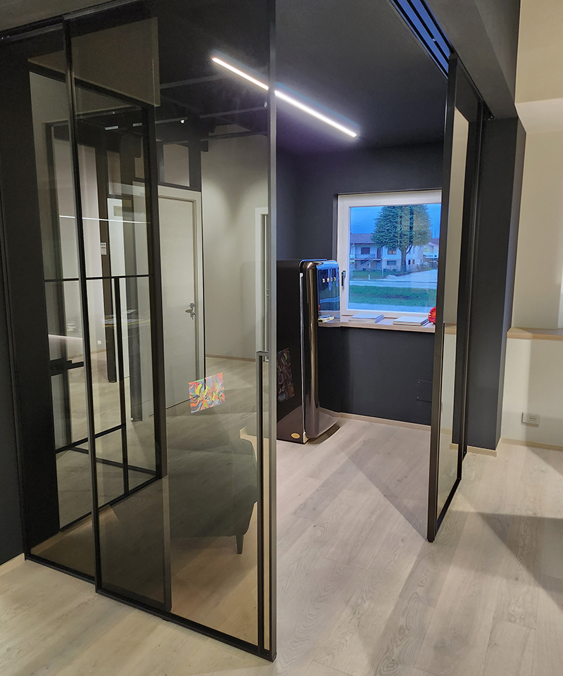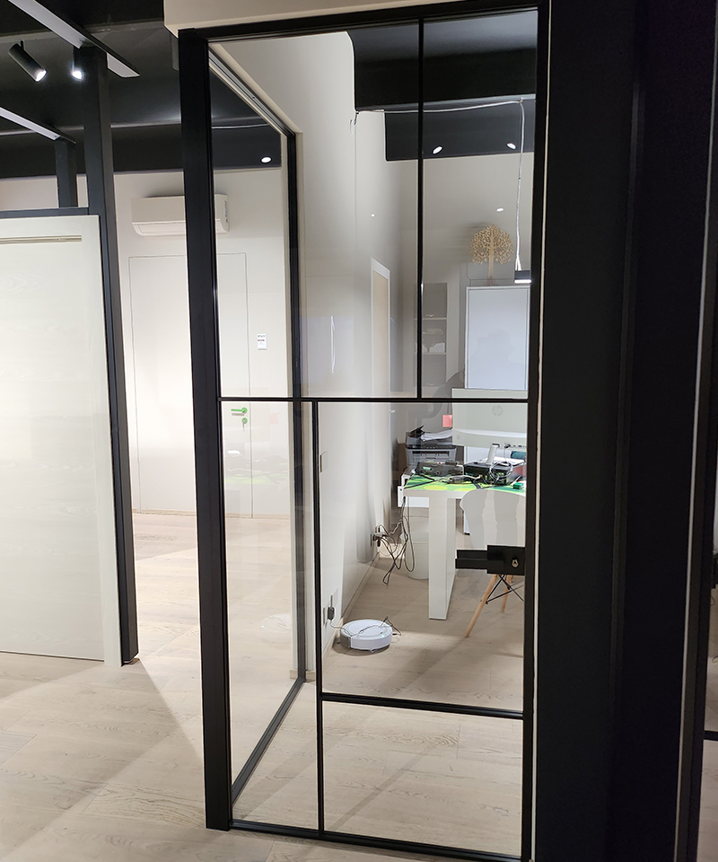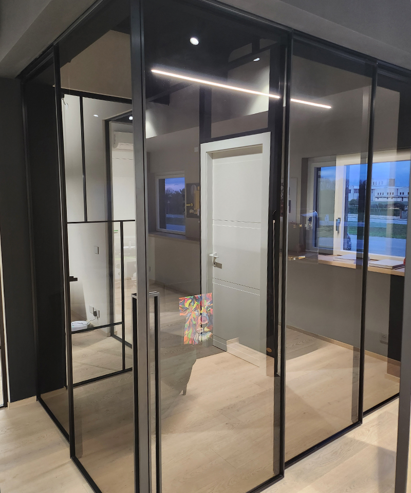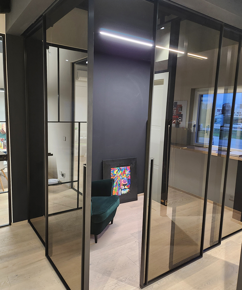 Diseño de cerramiento interno vanguardista para una oficina, transformando completamente el espacio de trabajo. Estos elementos se combinan para crear una sensación de amplitud y fluidez, al tiempo que proporcionan privacidad y funcionalidad.