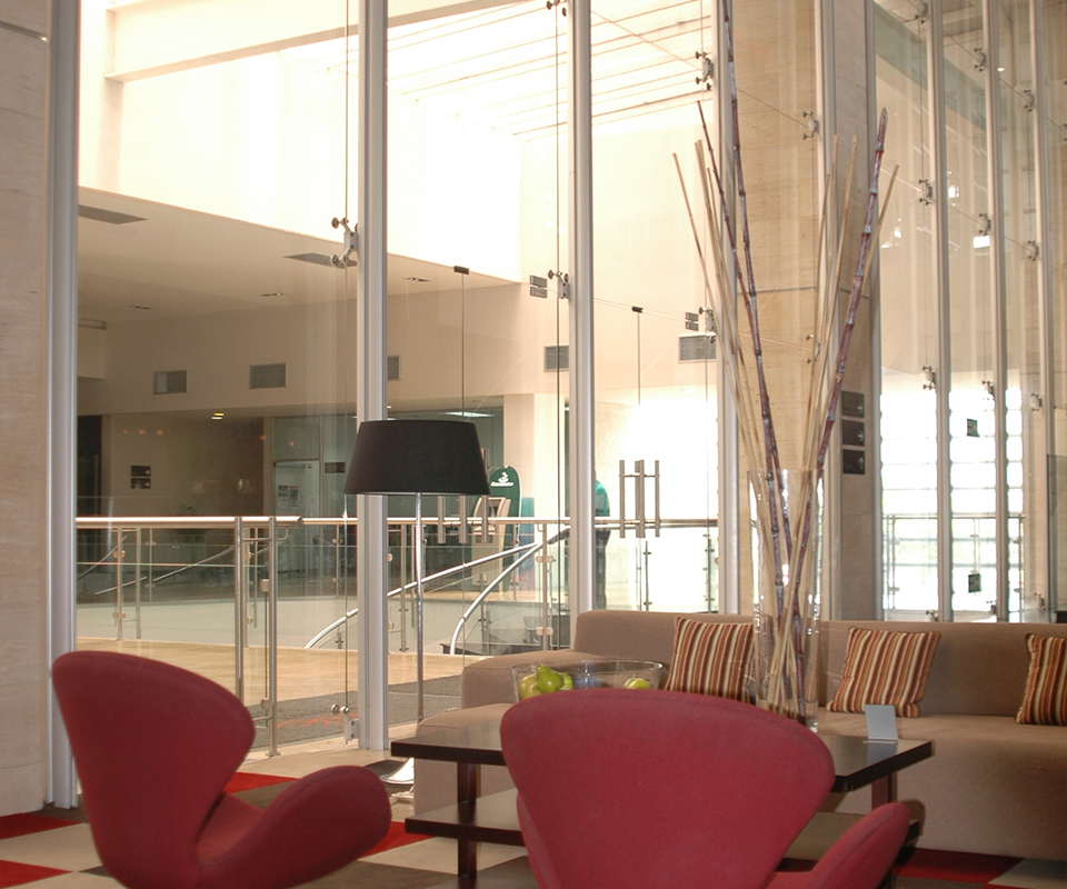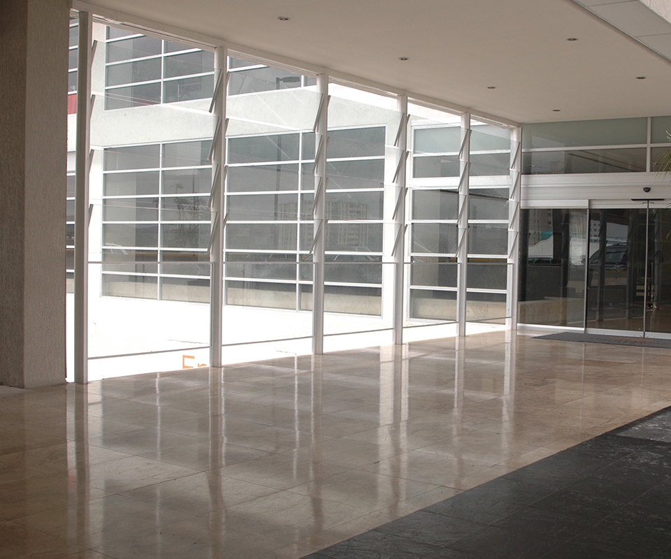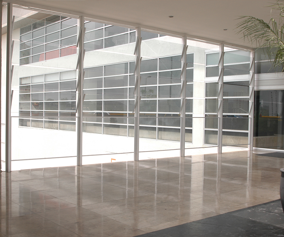 Para este hotel, se diseñaron dos tipos de cerramientos panorámicos. El primero consiste en cristales diseñados de manera especial, creando una arquitectura abierta con espacio entre cada vidrio. Este diseño permite una perfecta ventilación natural del pasillo de acceso. Por otro lado, el segundo cerramiento es una fachada de araña con tecnología italiana con sujeciones en acero inoxidable y aluminio.