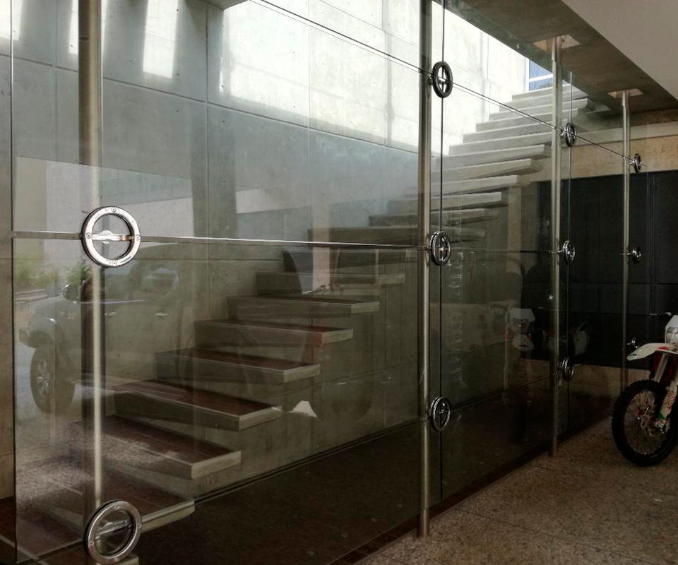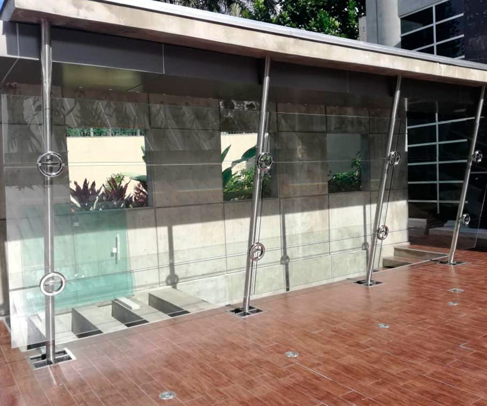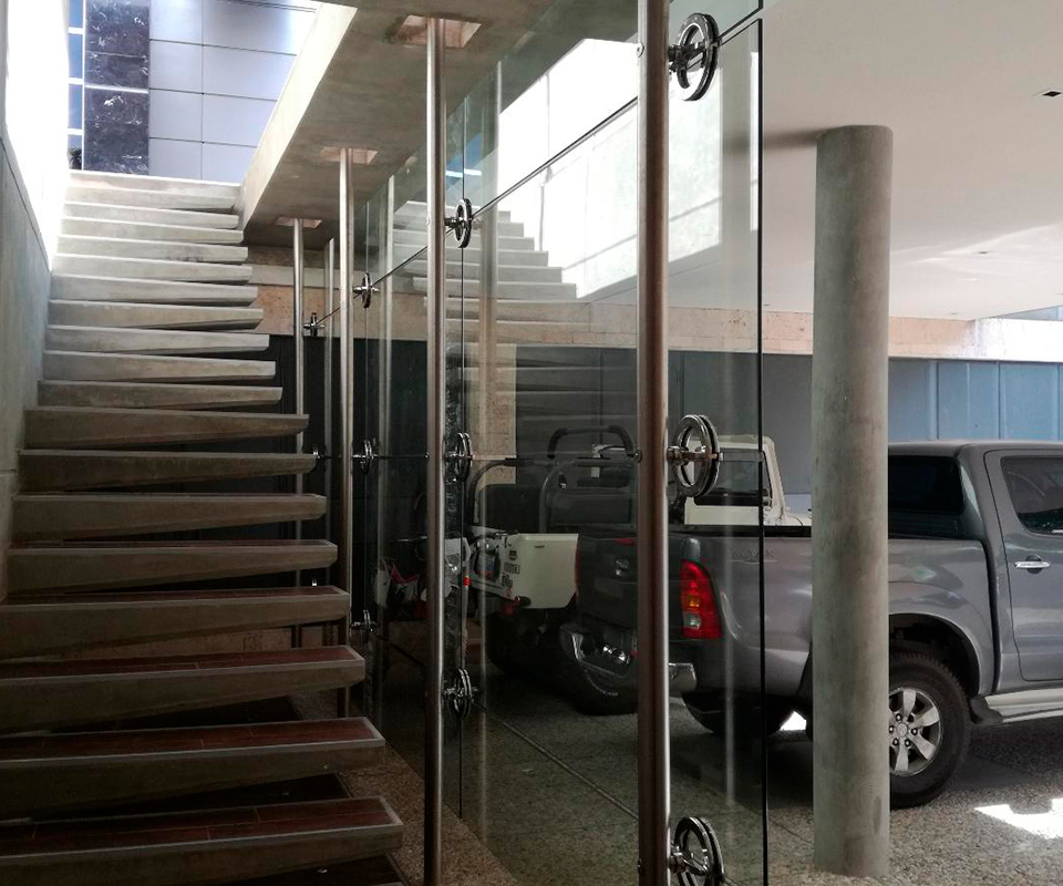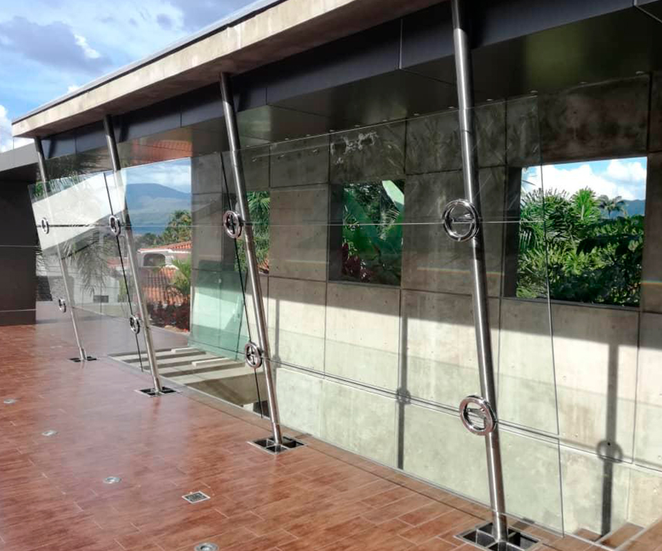 Cerramiento exclusivo con elegantes cristales y resistentes perfiles de aluminio. Este cerramiento, diseñado con esmero, combina la transparencia de los cristales con la solidez de perfiles y accesorio en acero inoxidable (Faraone Italia). Formado por una estructura desde planta baja hasta el segundo nivel, este elemento visual crea un espacio vanguardista y completamente personalizado para el proyecto.
